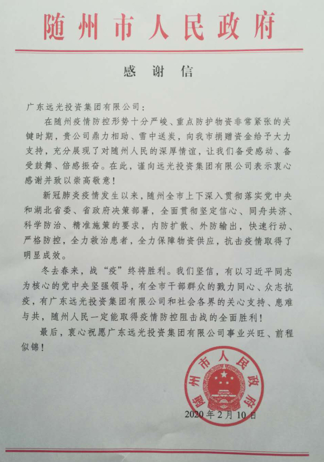 清远市民政局局长、慈善总会会长梁金鉴还宣读了湖北省随州市政府的感谢信。信中表示:在随州市疫情防控进入关键阶段,各类资源十分紧张的情况下,远光投资集团有限公司倾力相助,充分展现了无私大爱,体现了对随州人民的深厚情谊。随州市政府和全市258万人民,向远光投资集团有限公司表示衷心感谢并致以崇高敬意,向远光集团送上美好祝福!