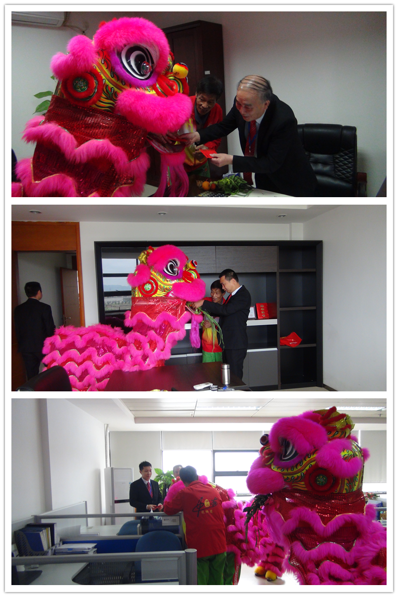 在礼炮齐鸣、掌声雷动的喜庆热闹气氛下,两只活灵活现的“雄狮”时分时合、时跳时立,各种道喜采青的高难度的动作获得满堂喝彩。