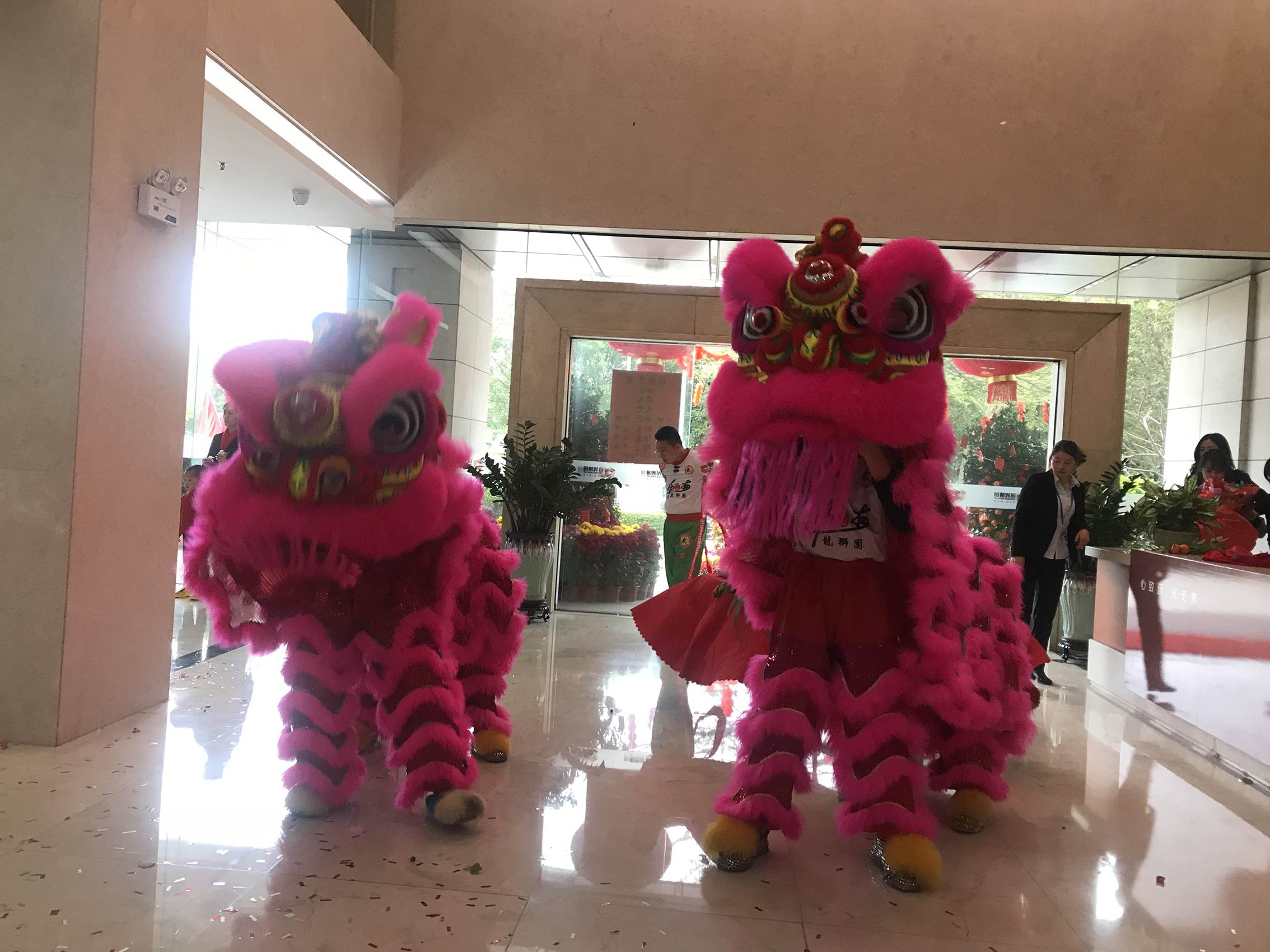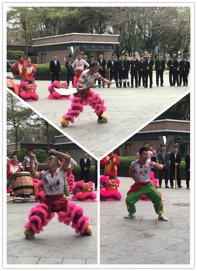 仪式最后,在震耳欲聋的锣鼓声中进行了狮队武术表演,演员们将雄狮的各种表情和动作演绎得活灵活现,还带来了独具特色的“高杆采青”表演,采青完毕后,两只狮子的嘴里“吐”出“恭祝健康发财、笑口常开”的祝福,赢得了在场一浪接一浪的喝彩声。
