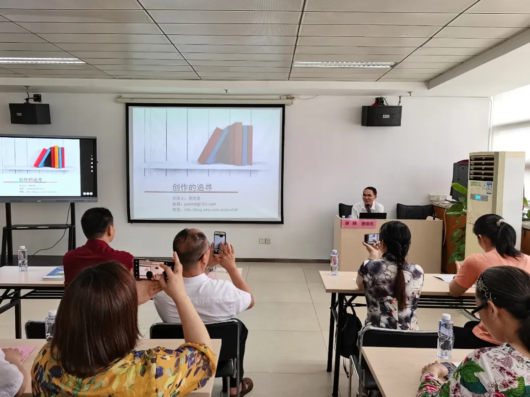 活动还邀请到国家一级作家、广东鲁讯文学奖获得者唐德亮老师授课。唐老师从“如何追赶先进”、“如何寻求突破”、“如何超越平庸”等方面,对文学创作的创新突破进行了全方位的讲解,并从散文的“发展态势”、“存在问题”,如何“积累经验”、“精心打磨”等方面进行传道、授业、解惑,寄语作家代表们和文学爱好者们要多读、多写,对自己的作品多推敲、多修改,争取早日出精品,成为文学大家。