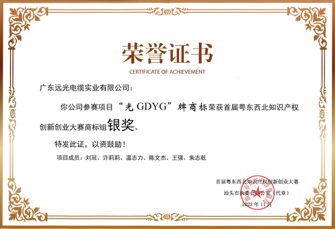 公司领导高瞻远瞩,1999年9月,远光电缆便注册了第一个商标,同时也是本次粤创赛的参赛商标,使用至今已超过20年,获得了广东省市场质量信用AAA级用户满意品牌等称号,并于2022年4月入选广东省重点商标保护名录。截至目前,公司拥有的注册商标、发明专利等领跑同行。