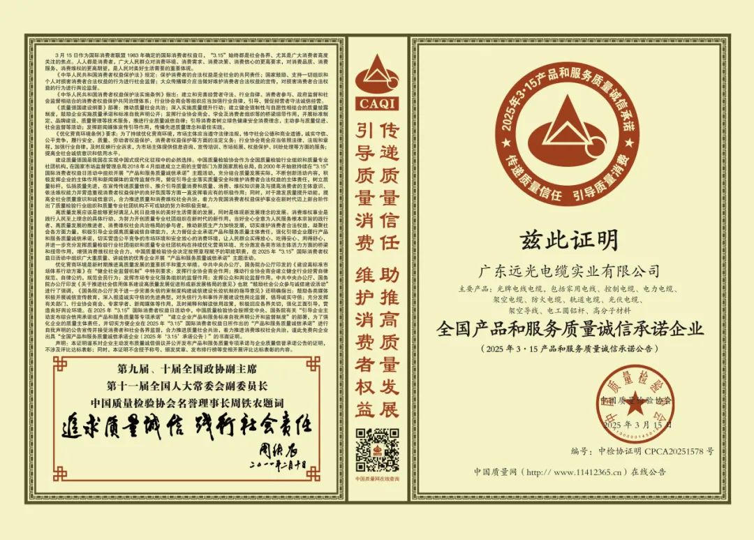 在2025年“3·15”国际消费者权益日这天,远光电缆凭借过硬的产品质量、完善的服务体系以及始终如一的诚信经营理念,荣获中国质量检验协会颁发的“全国产品和服务质量诚信承诺企业”称号。这一殊荣,不仅是对远光电缆多年来坚持质量至上、诚信经营的充分肯定,更是对远光品牌影响力和市场竞争力的高度认可。