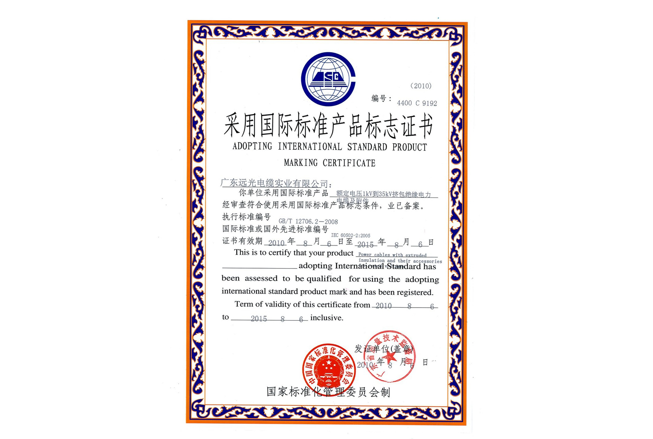 采标证书-额定电压1kV到35kV挤包绝缘电力电缆