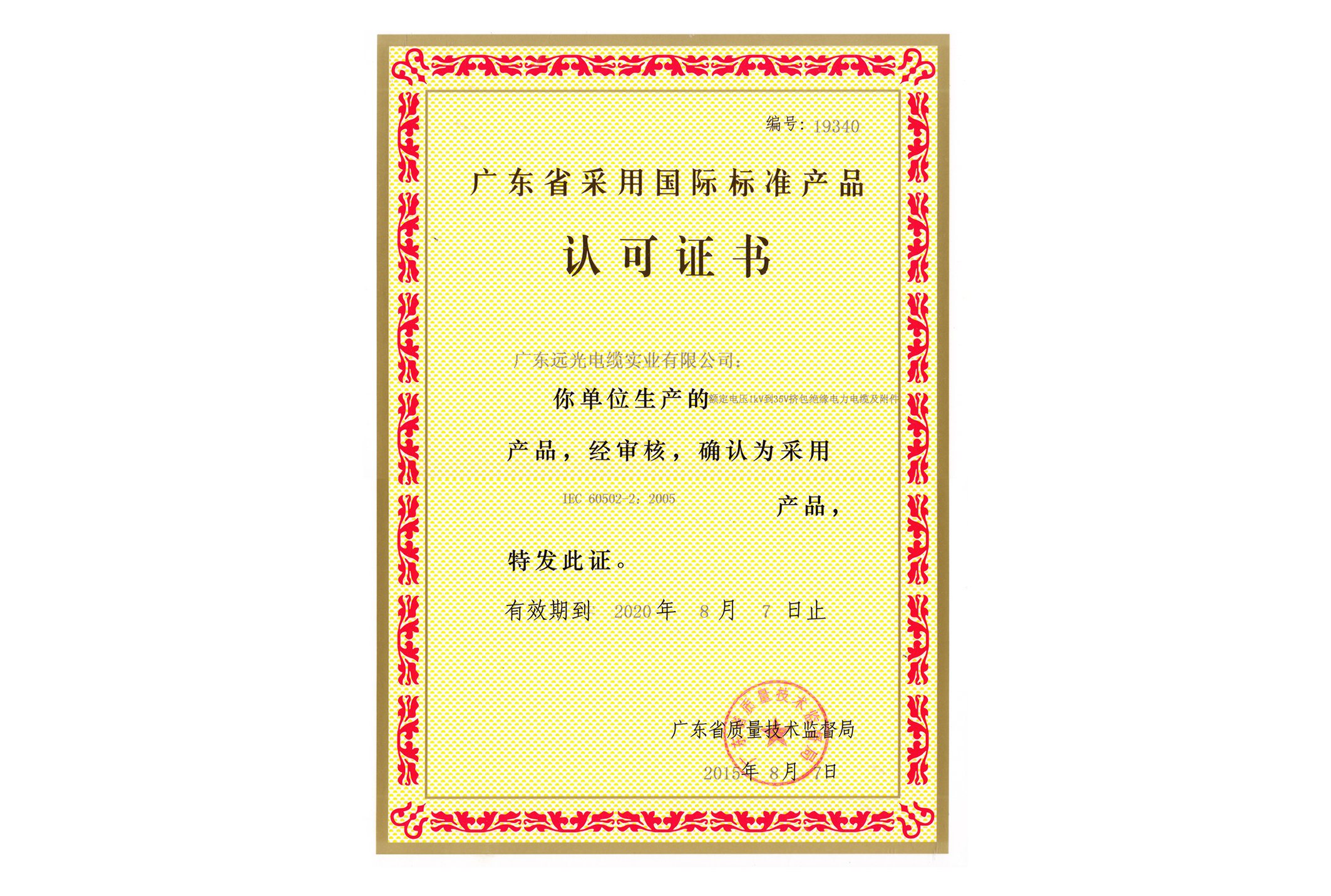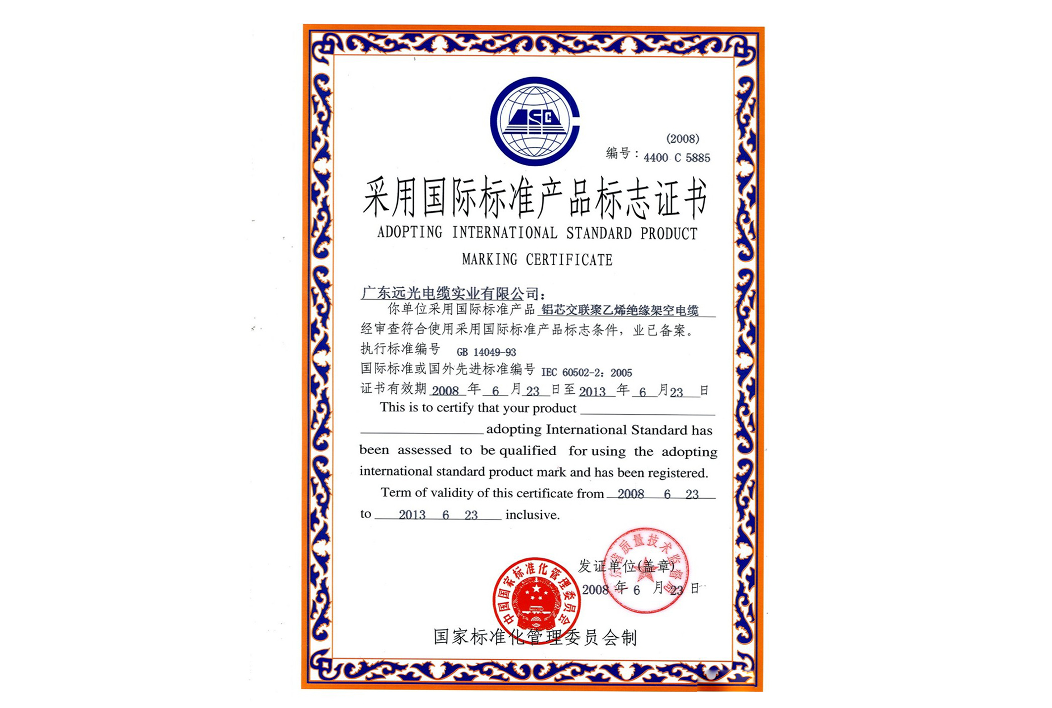 采标认可证书-铜芯聚氯乙烯护套钢带铠装KY中国官方网站
