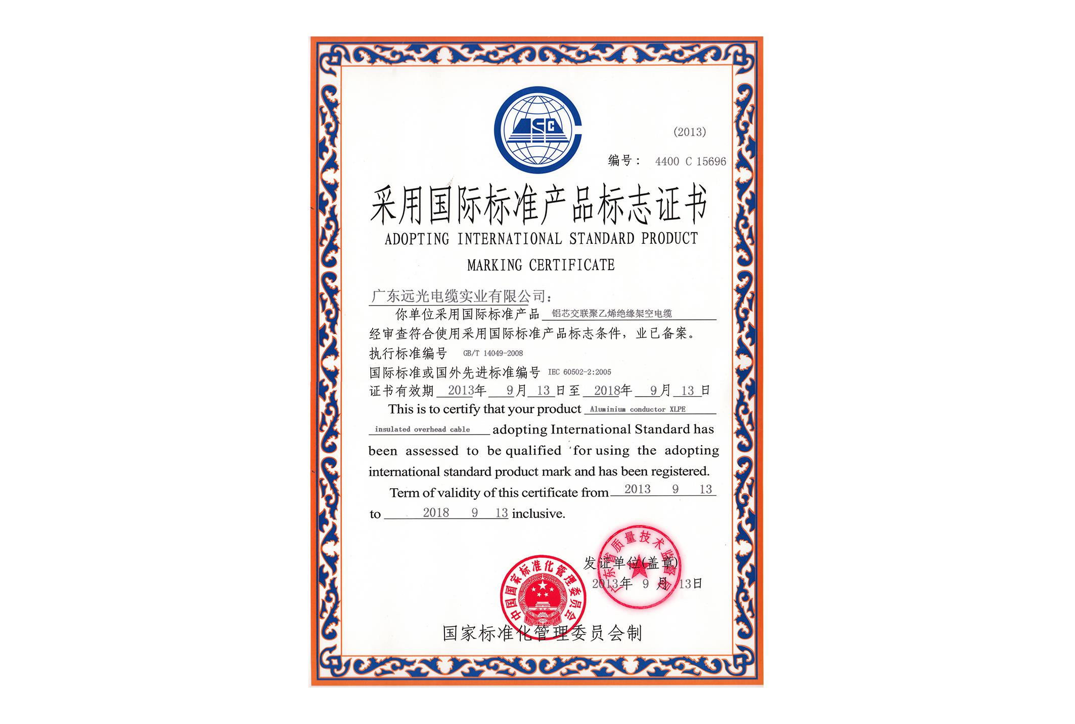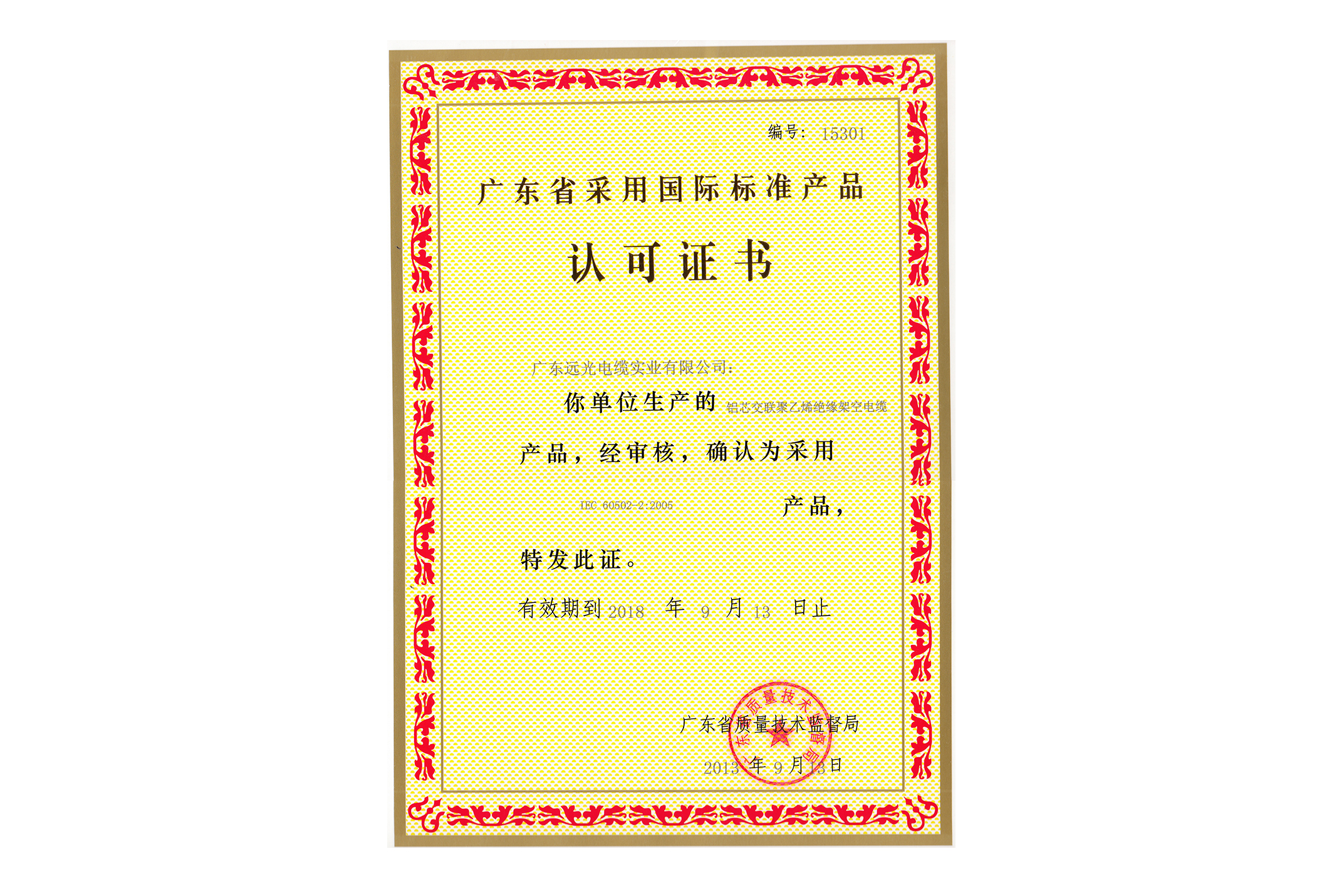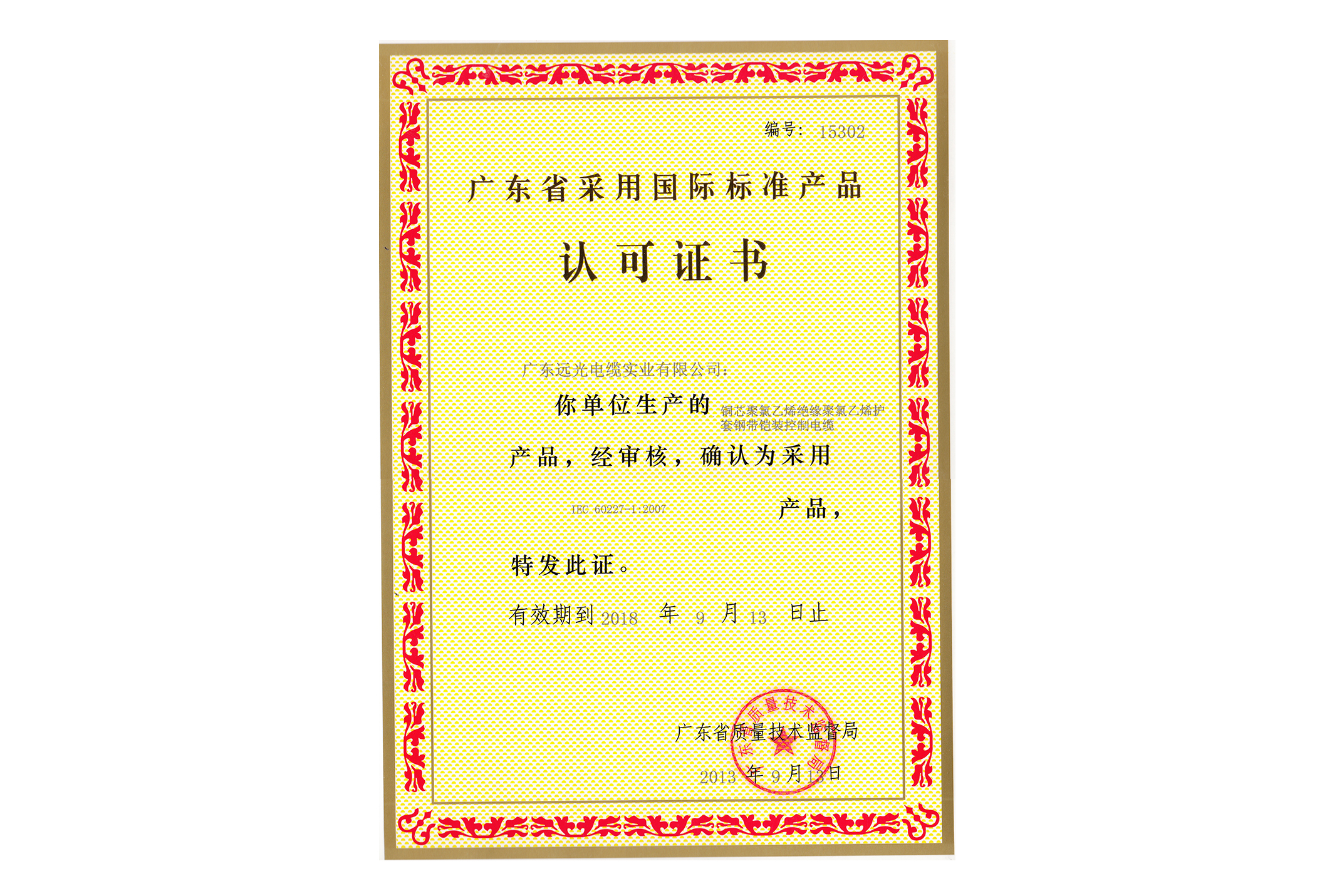 采标认可证书-额定电压450V/750V及以下聚氯乙烯绝缘电缆