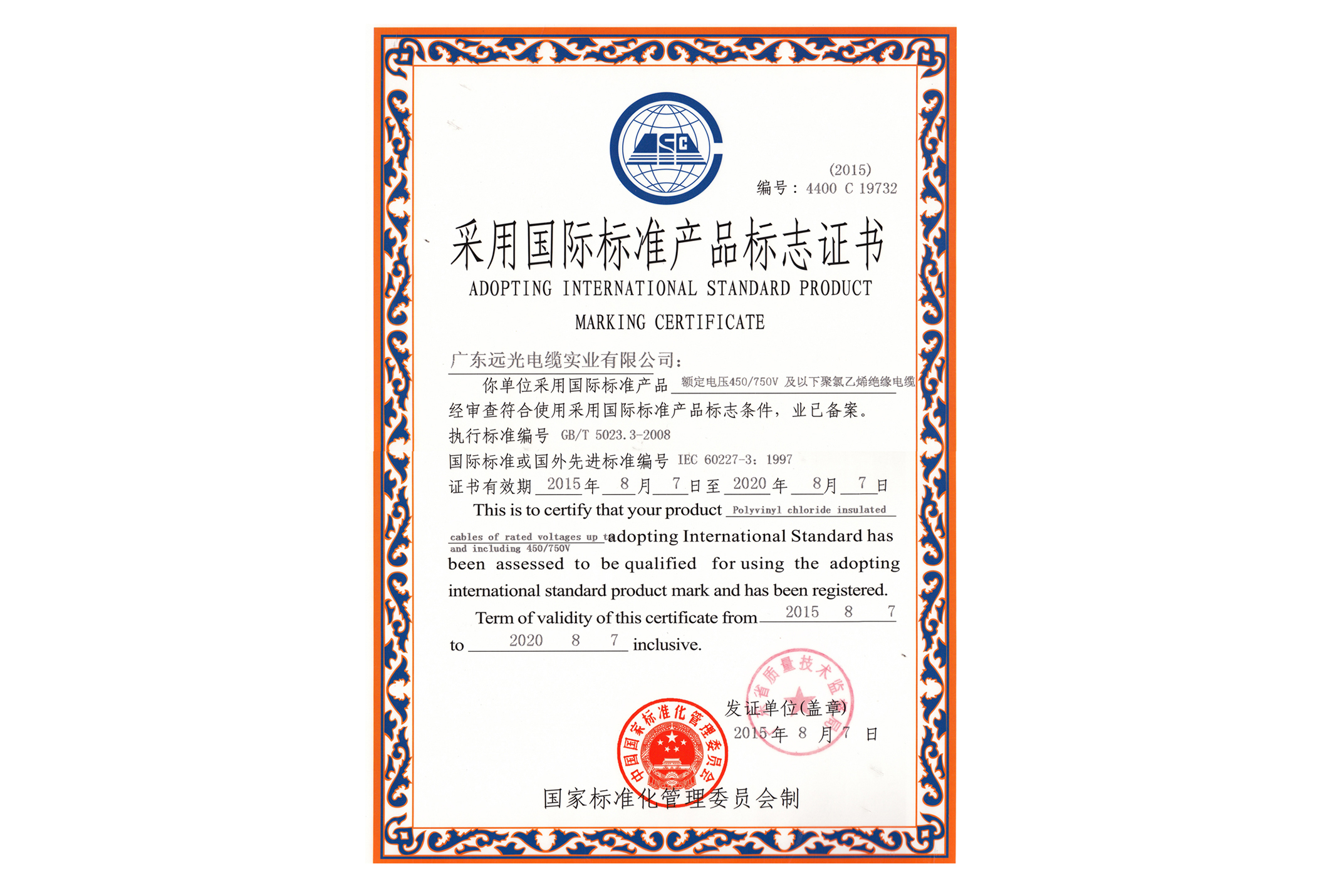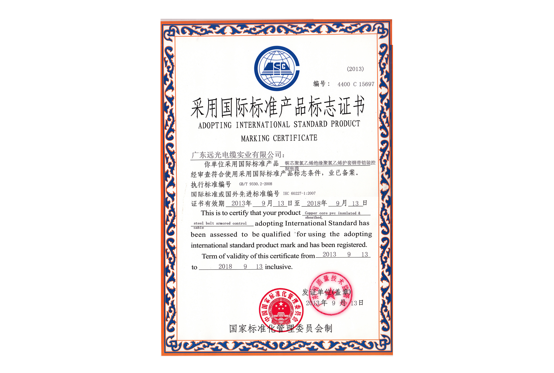 采标证书-额定电压450V/750V及以下聚氯乙烯绝缘电缆