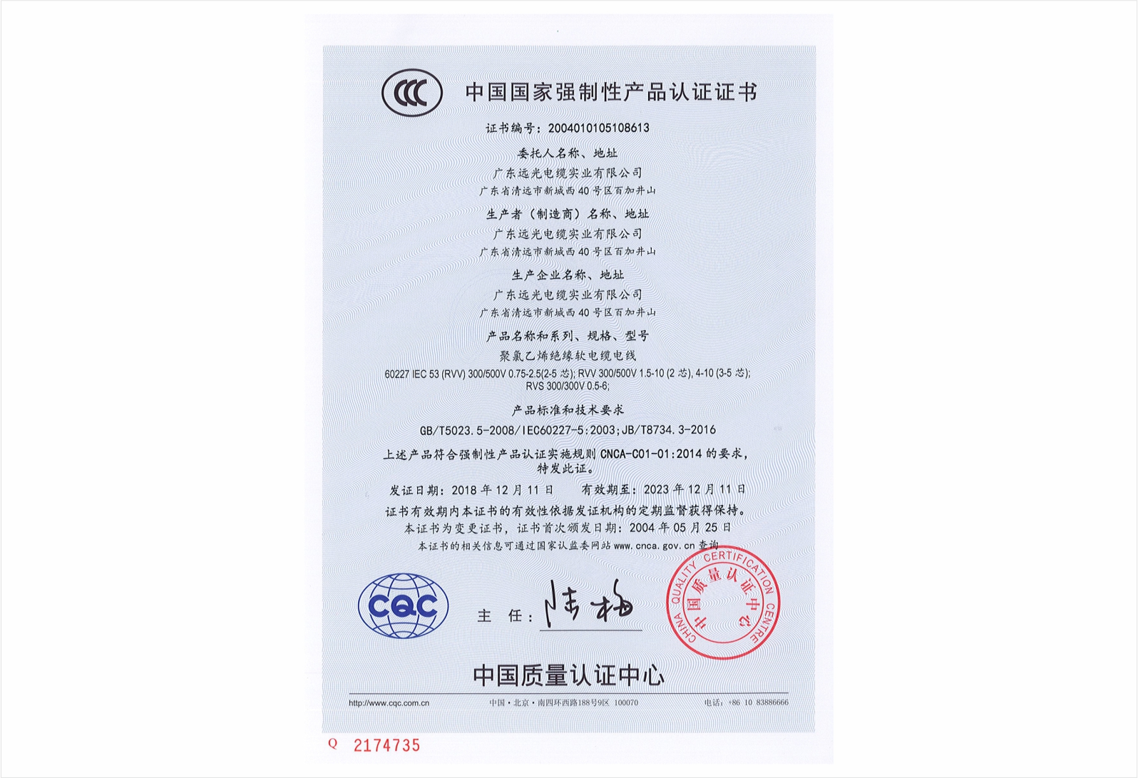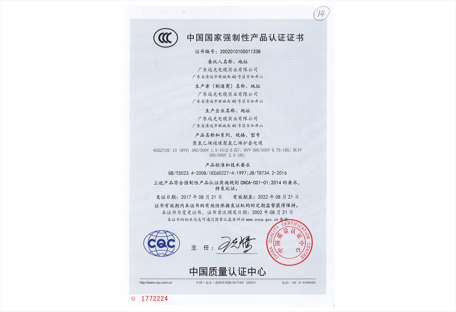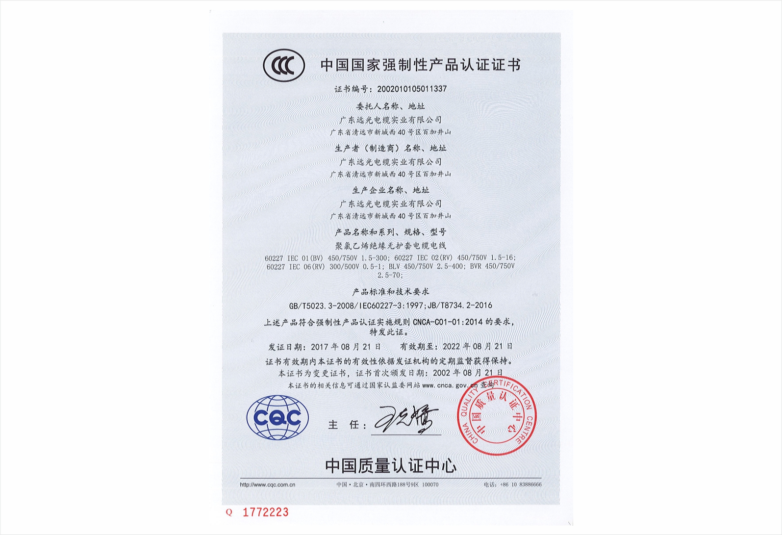 聚氯乙烯绝缘聚氯乙烯护套电缆国家强制性产品3C认证证书