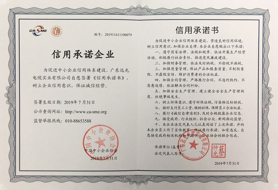 远光电缆荣获中国中小企业协会“企业信用等级AAA证书”